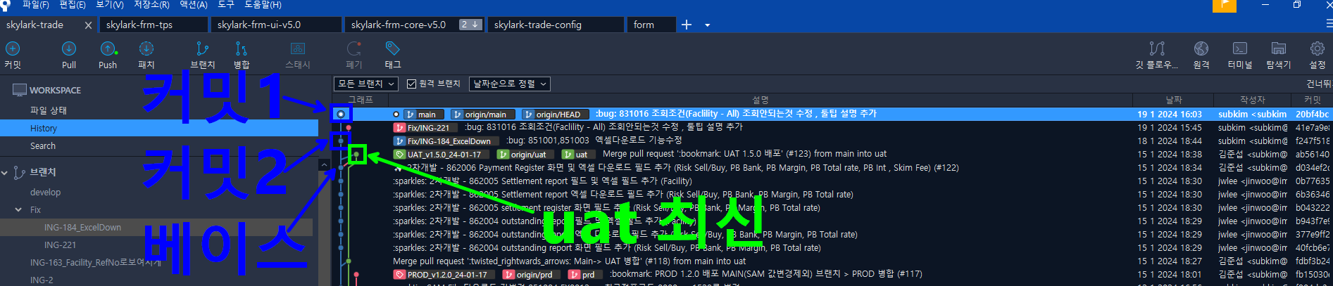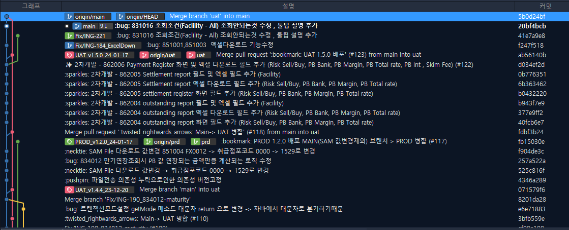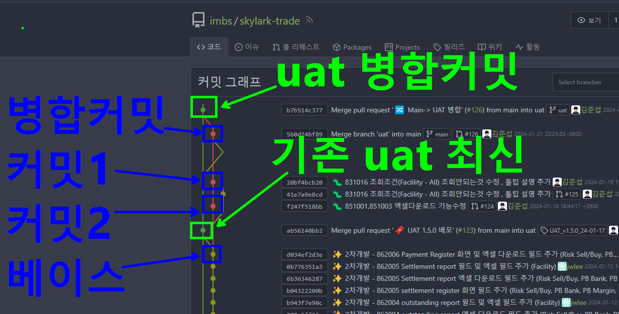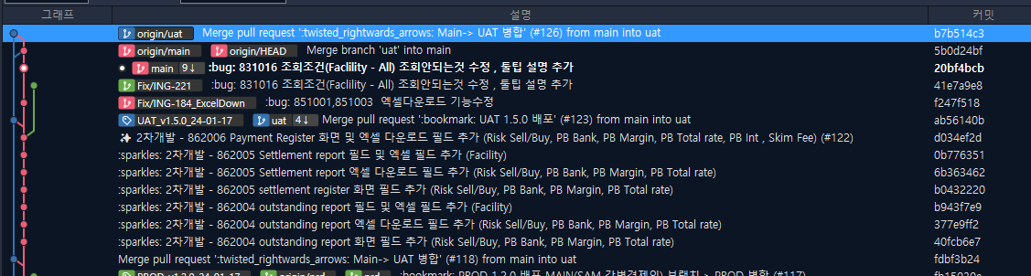 브랜치 업데이트된이후 - 원격그래프 main 브랜치에 uat 브랜치를 병합한 병합커밋이 생긴다.