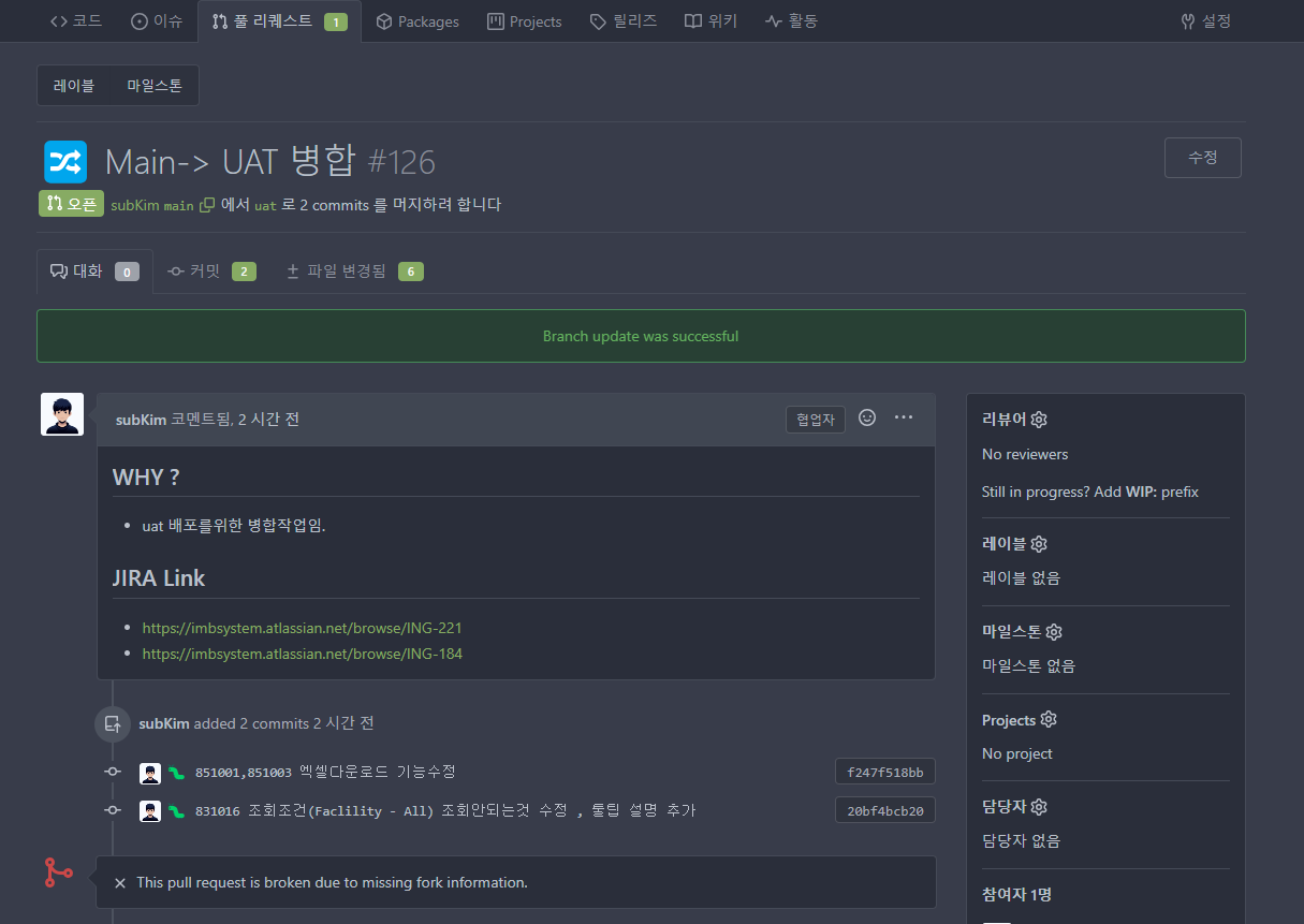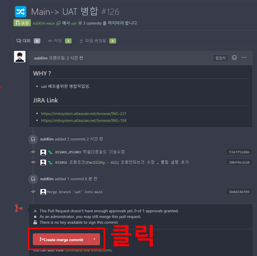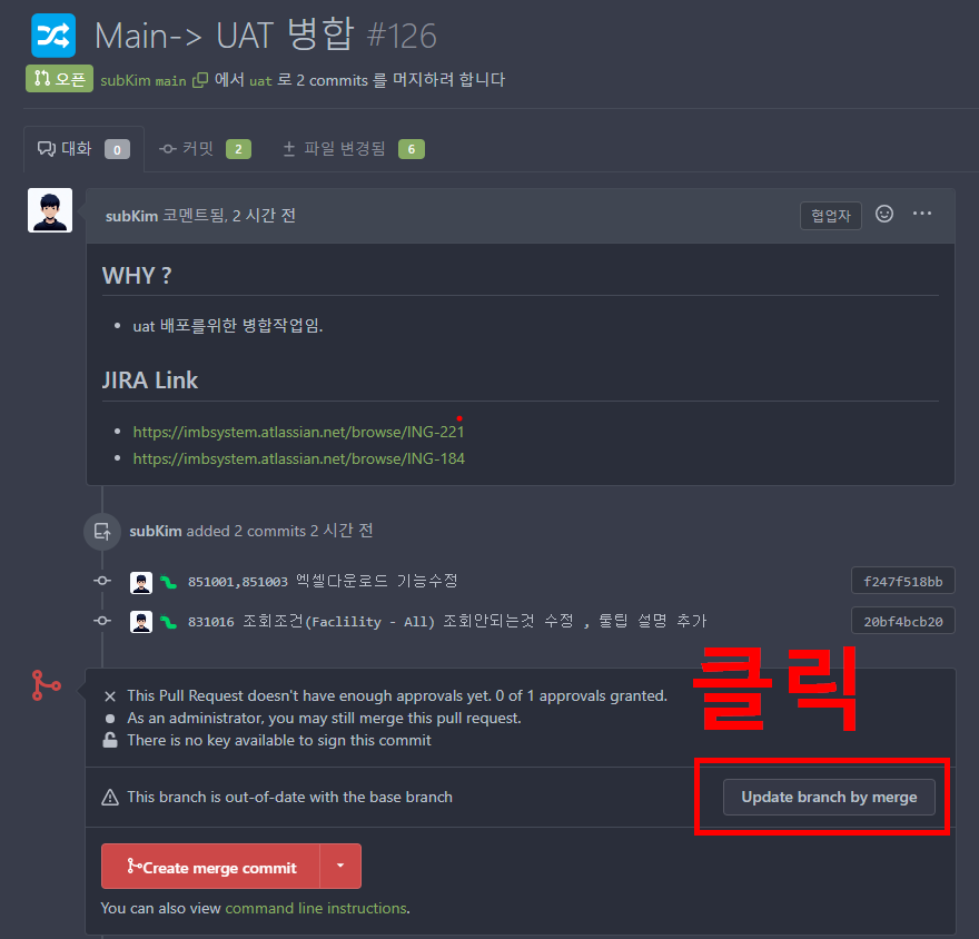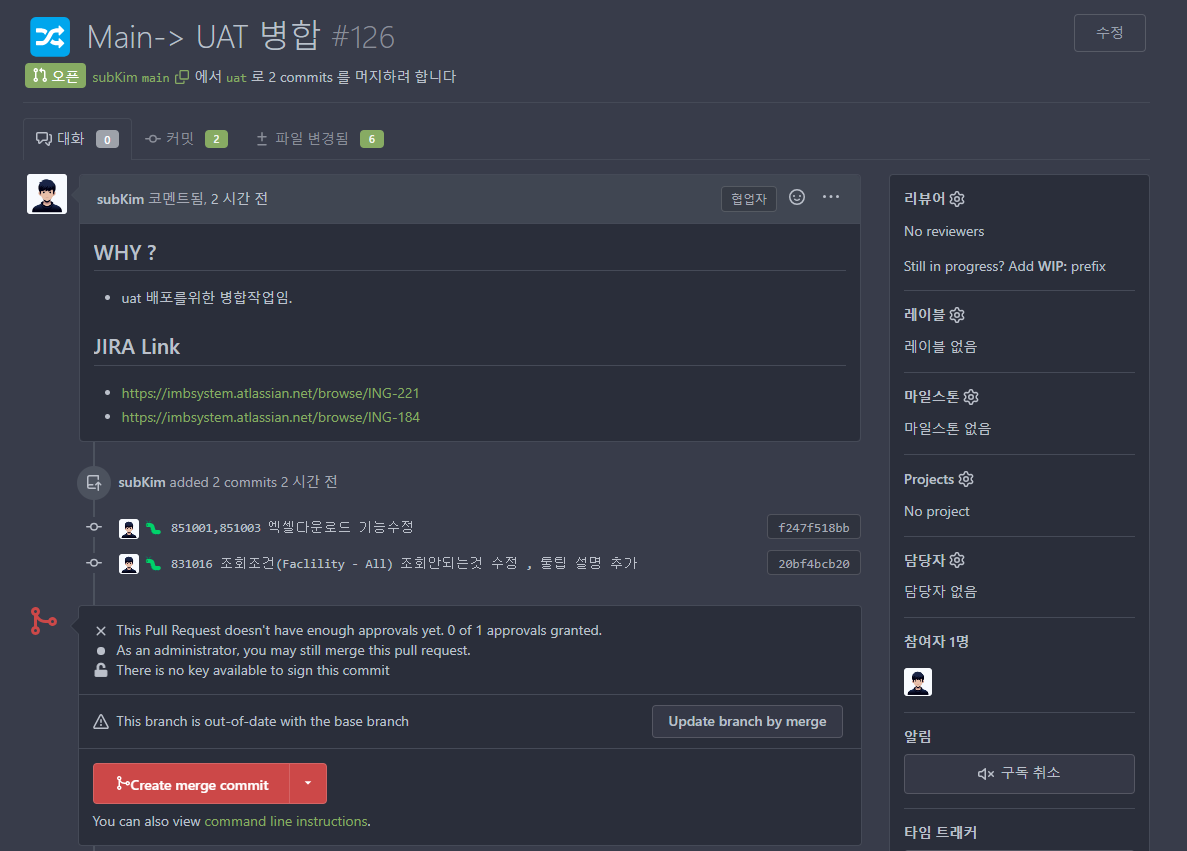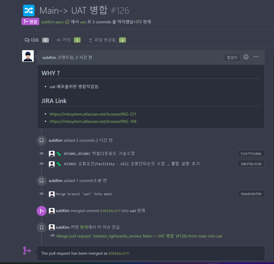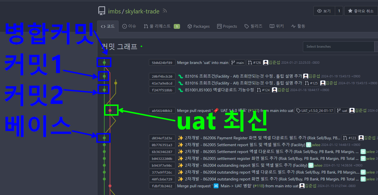 커밋1,2 가 포함된 main 브랜치를 uat 브랜치에 원격끼리 병합하려고 main → uat 로 PR 요청을함.