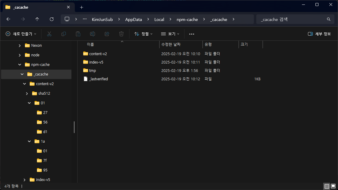 _cacache/ ├── content-v2/ │ └── sha512/ # 실제 패키지 컨텐츠 (해시로 저장) ├── index-v5/ # 메타데이터 인덱스 └── tmp/ # 임시 파일들